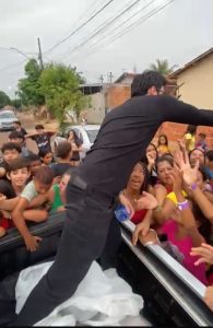 “O advogado ostentação transforma o Dia das Crianças em palco de sua política populista, jogando brinquedos para as crianças enquanto reforça sua imagem de figura controversa e próxima do povo.”