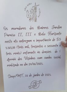 O valor é oriundo de doações e arrecadações do 1° Arraiá dos Vizinhos dos moradores dos Bairros Jardim Paraíso II, III e Belo Horizonte ocorrido no último sábado (24.06).