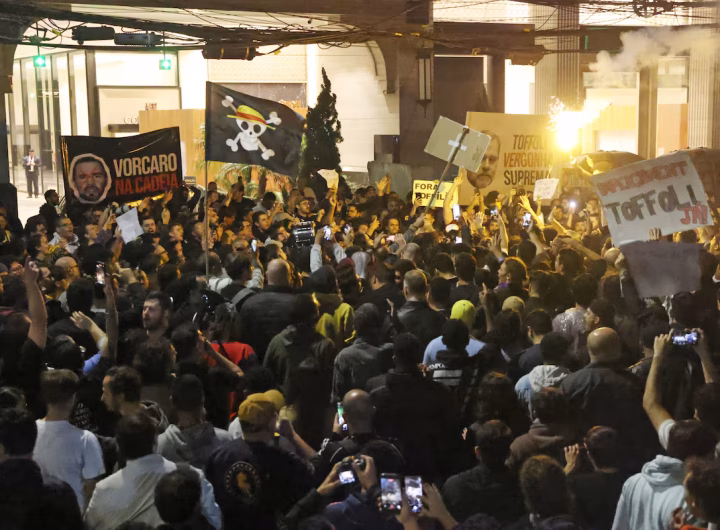 Protesto em frente à sede do Master convocado pelo MBL pede afastamento de Toffoli do caso
