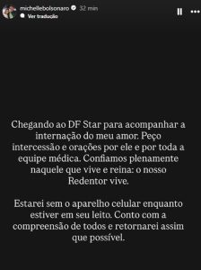 Na sua mensagem, Michelle pediu apoio e orações pela saúde do marido. Confira: