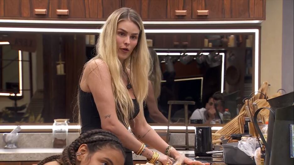 Ela comia um pedaço de bolo na cozinha e percebeu que Rodriguinho, Luigi e Nizam estavam olhando para ela. Então, afirmou: “Cara, agora toda vez que eu toco na comida vocês três me olham. É horrível isso”.