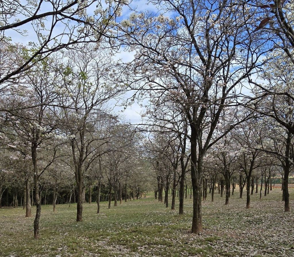 Famosos também como planta do mel, os ipês têm sua floração por um período bem curto e suas flores quando caem formam um grande tapete de flores brancas.