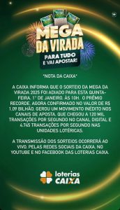 A Caixa informou que o sorteio da Mega da Virada 2025 foi adiado para esta quinta-feira, 1° de janeiro, às 10h, em razão da necessidade de ajustes operacionais.