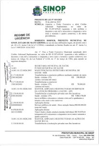 A Câmara Municipal de Sinop irá analisar, na sessão do próximo dia 26 de maio, o Projeto de Lei nº 033/2025, de autoria do Poder Executivo, que solicita a abertura de um crédito adicional suplementar no valor de R$ 43.207.659,64 (quarenta e três milhões, duzentos e sete mil, seiscentos e cinquenta e nove reais e sessenta e quatro centavos). A proposta, que tramita em regime de urgência, será apreciada em votação única.