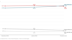 No levantamento mais recente, Lula tem 39,6% contra 35,3% de Flávio no primeiro cenário. A diferença, que era de 6,7 pontos percentuais em janeiro, caiu para 4,3 pontos percentuais.