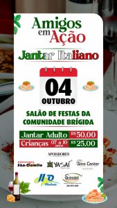 A Comunidade Brígida, em Sinop, será palco de um encontro marcado pela solidariedade e pelo sabor da culinária italiana. No dia 4 de outubro, a partir das 19h, acontece o Jantar Italiano Solidário, iniciativa organizada por amigos e voluntários para arrecadar recursos em apoio a uma pessoa querida da comunidade que enfrenta um delicado tratamento de saúde.