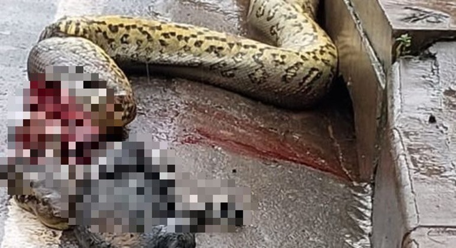 CORTARAM NO MEIO : Sucuri de barriga cheia é morta após moradores desconfiarem que ela havia comido criança