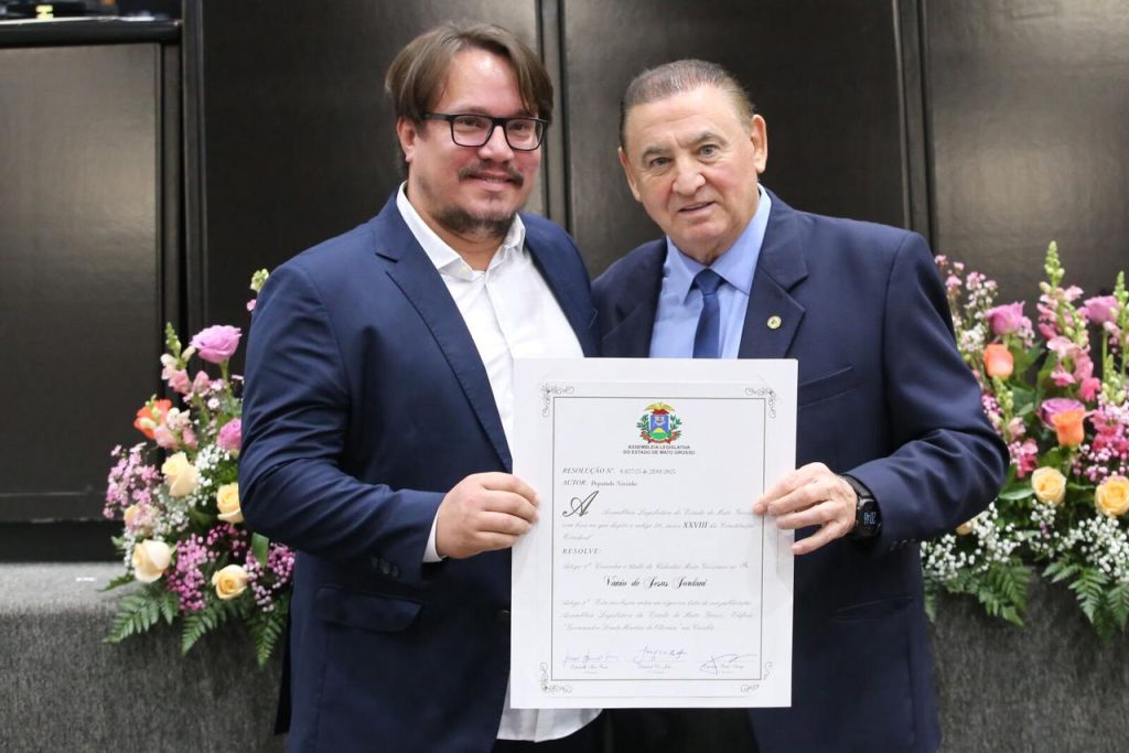 O médico cirurgião e secretário municipal de Saúde de Sorriso, Dr. Vanio de Jesus Jordani, recebeu o Título de Cidadão Mato-grossense durante sessão especial da Assembleia Legislativa de Mato Grosso (ALMT), em homenagem que reconheceu sua contribuição à saúde pública do estado. A honraria foi proposta pelo deputado Ondanir Bortolini, o Nininho (Republicanos), e aprovada com base no artigo 26, inciso XXVIII, da Constituição Estadual, combinado com a Resolução nº 6.597/2019, publicada em 28 de janeiro de 2025, que oficializou a concessão do título ao secretário. A cerimônia integrou a entrega de 68 honrarias a cidadãos que contribuíram para o desenvolvimento de Mato Grosso desde a década de 1970, incluindo títulos de Cidadão Mato-grossense, comendas e moções de aplauso.