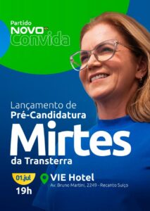 O Partido Novo realizará um evento de lançamento na próxima segunda-feira, 1º de julho, para anunciar Mirtes Grota como pré-candidata à prefeita de Sinop, além de apresentar seus pré-candidatos a vereadores. A cerimônia ocorrerá no Hotel VIE, localizado na Avenida Bruno Martini, nº 2249, no bairro Recanto Suíço. O evento é aberto ao público, e todos os cidadãos estão convidados a participar.
