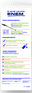 É obrigatório levar caneta esferográfica de tinta preta, fabricada em material transparente, e documento de identificação válido, físico ou digital. Também é aconselhável levar o cartão de confirmação de inscrição. Se o candidato precisar justificar sua presença no exame, ele deve levar impressa a declaração de comparecimento, que será assinada pelo aplicador do exame. A declaração está disponível na Página do Participante.