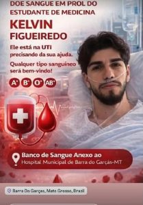 Kelvin Figueiredo Sousa Silva, um estudante de medicina de 23 anos e filho da vereadora Poliany Figueiredo (PSB), de Torixoréu, está internado em coma induzido na Unidade de Terapia Intensiva (UTI) após um acidente de trânsito. O incidente ocorreu na madrugada do último domingo (22), na rodovia MT-100, no município de Ribeirãozinho, a 538 km da capital Cuiabá. Kelvin sofreu traumatismo craniano, e a família mobiliza uma campanha urgente por doações de sangue, que podem ser realizadas no banco anexo ao Hospital Municipal de Barra do Garças.