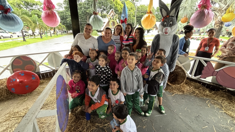 Além da decoração alusiva à Páscoa, os estudantes interagiram com coelhos reais; famílias são convidadas a visitar e prestigiar o espaço até o dia 5 de abril