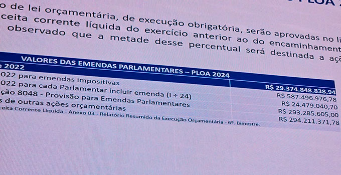Considerando os 2%, aprovado pela AL por meio de emenda constitucional, e cada deputado indicando R$ 24,4 milhões, as emendas dos 24 parlamentares somariam R$ 585,6 milhões.