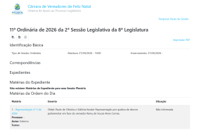 A informação foi obtida pela reportagem por meio do portal oficial da Câmara Municipal, onde consta a pauta da sessão. A representação, protocolada por dois moradores do município, aparece na ordem do dia e ainda não possui situação definida . A reportagem não teve acesso ao teor completo da denúncia, sendo possível confirmar apenas sua inclusão na pauta para leitura e possível recebimento pelo plenário.