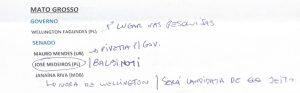 Para o Senado, o documento ainda cita o governador Mauro Mendes (União) como principal nome competitivo e indica que o próprio Mendes trabalha para fazer do vice-governador Otaviano Pivetta (Republicanos) seu sucessor ao Governo do Estado. “Pivetta p/ Governo”, registra a anotação.