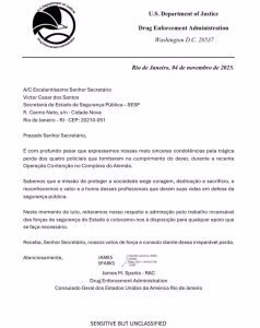 O comunicado, assinado por James Sparks, do setor de Repressão às Drogas do Departamento de Justiça dos Estados Unidos, foi recebido uma semana após a operação. A carta expressa “profundo pesar” e “mais sinceras condolências pela trágica perda dos quatro policiais que tombaram no cumprimento do dever, durante a recente Operação Contenção no Complexo do Alemão”, e reitera “respeito e admiração pelo trabalho incansável das forças de segurança do Estado”.