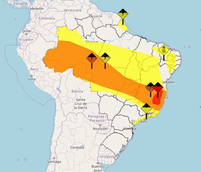 Já o alerta classificado como perigo aponta possibilidade de chuva mais intensa, entre 30 e 60 mm por hora ou de 50 a 100 mm por dia, com ventos que podem chegar a 100 km/h. Nesse cenário, o risco de interrupção no fornecimento de energia, alagamentos e quedas de árvores é considerado maior.