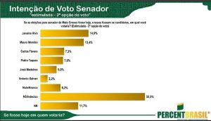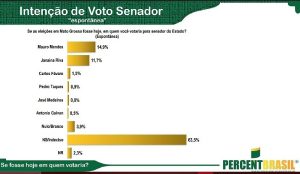 Quando a pesquisa apresentou uma lista de possíveis candidatos (cenário estimulado), Mauro Mendes aumentou seu apoio, chegando a 40,5% das preferências. Para a segunda vaga, Janaina Riva mostrou sua força, marcando 23,4% dos votos. Carlos Fávaro permaneceu em terceiro lugar, com 4,0%. Outros nomes que apareceram foram José Medeiros (PL) com 3,8%, Pedro Taques (PSB) com 3,3%, e Antonio Galvan com 1,7%. Neste cenário, o número de indecisos diminuiu para 17,1%, com apenas 0,5% não respondendo.