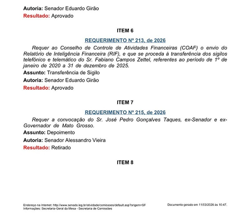 Com a decisão da CPI, tanto Mauro Mendes quanto Pedro Taques deverão apresentar suas manifestações formais por escrito aos senadores. A convocação presencial do ex-governador não foi descartada e pode voltar a ser analisada pela comissão em sessões futuras, dependendo da avaliação dos integrantes do colegiado.