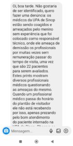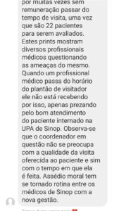 “Oi, boa tarde. Não gostaria de ser identificado (a), quero fazer uma denúncia: os médicos da UPA de Sinop estão sendo coagidos e ameaçados pelo menino sem experiência que foi colocado como responsável técnico, onde ele ameaça de demissão os profissionais por muitas vezes sem remuneração passar do tempo de visita, uma vez que são 22 pacientes para serem avaliados. Estes prints mostram diversos profissionais médicos questionando as ameaças do mesmo. Quando um profissional médico passa do horário do plantão de visitador ele não está recebendo por isso, apenas prezando pelo bom atendimento do paciente internado na UPA de Sinop. Observa-se que o coordenador em questão não se preocupa com a qualidade da visita oferecida ao paciente e sim com o tempo em que ela é feita. Assédio moral tem se tornado rotina entre os médicos de Sinop com a nova gestão.”