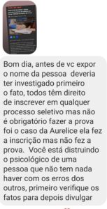 Bom dia, antes de vc expor o nome da pessoa deveria ter investigado primeiro o fato, todos têm direito de inscrever em qualquer processo seletivo mas não é obrigatório fazer a prova foi o caso da Aurelice ela fez a inscrição mas não fez a prova. Você está distruindo o psicológico de uma pessoa que não tem nada haver com os erros dos outros, primeiro verifique os fatos para depois divulgar