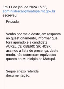 11/01/2024 e-mail da Secretaria Municipal de Administração de Matupá para nossa redação