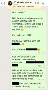 reportagem do PNB Online teve acesso ao print de conversa em que uma das vítimas relata à primeira-dama Virgínia Mendes o incômodo com o locutor, que trabalha com Mauro Mendes (União) desde que o político era prefeito de Cuiabá. As mulheres alegam que, mesmo sem cargo público, a primeira-dama liderava a cadeia de comando no cerimonial e tinha influência nas decisões e que por conta disso foi procurada para auxiliar.