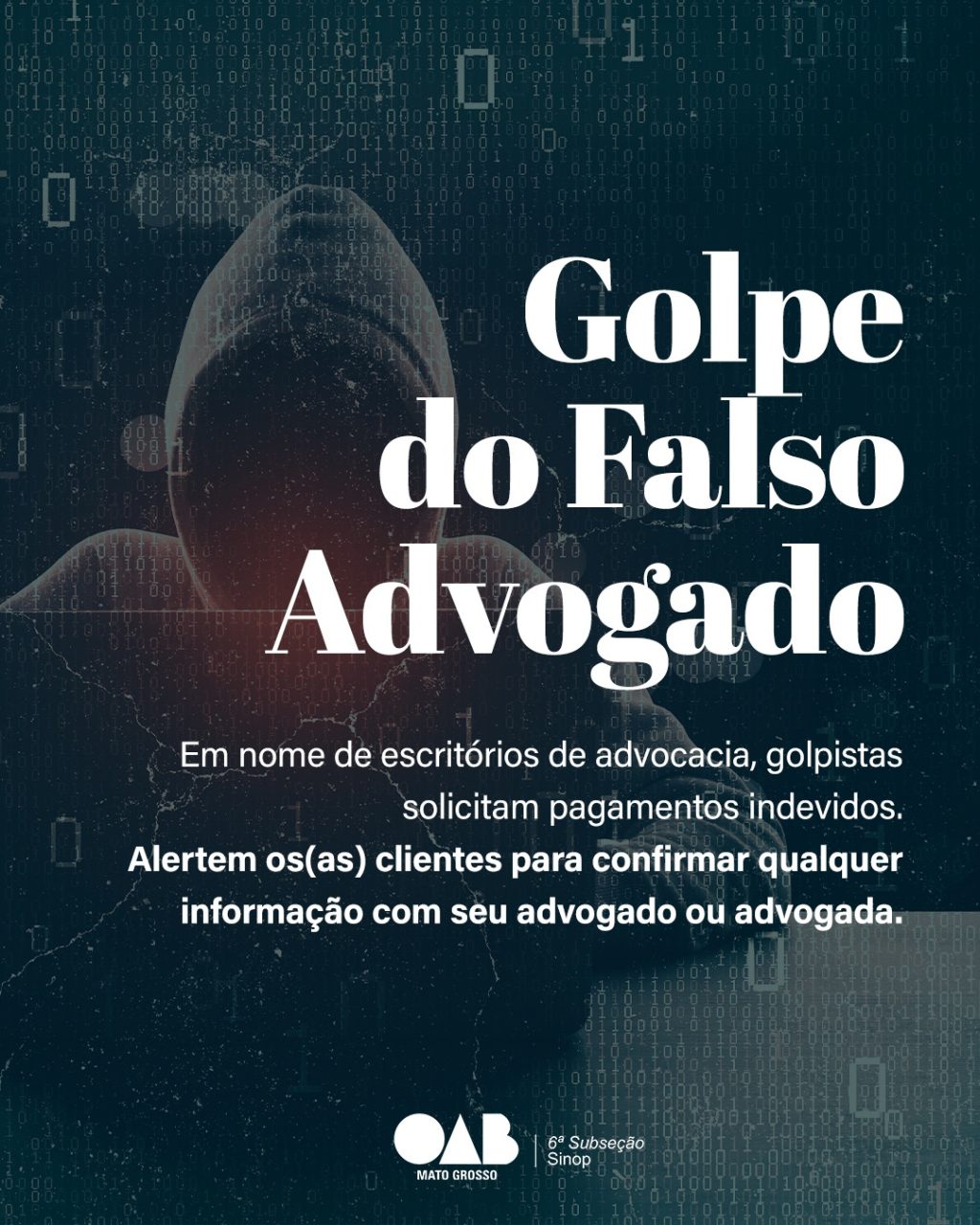 Desde 2022, a OAB 6ª Subseção de Sinop vem alertando a advocacia local sobre golpes aplicados contra clientes, nos quais criminosos se passam por advogados para obter vantagens financeiras. Naquele período e no ano seguinte, a subseção recebeu mais de 60 relatos de casos. Agora, a situação se agravou em todo o país, levando a OAB Nacional a lançar, nesta terça-feira (29/04), uma campanha nacional de combate ao chamado “golpe do falso advogado”.