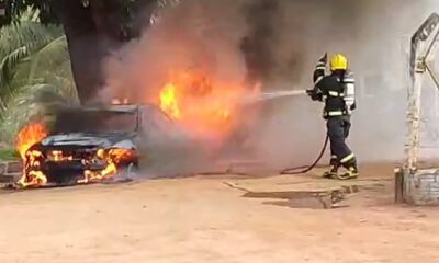O carro foi totalmente destruido Um carro da marca BMW pegou fogo após um homem tentar dispersar...