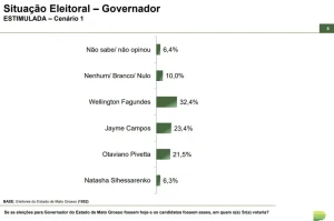 Um levantamento do instituto Paraná Pesquisas divulgado nesta quinta-feira, 18, aponta liderança do senador Wellington Fagundes (PL) na corrida pelo governo do Mato Grosso com 32,4% das intenções de votos. Na sequência, aparece o ex-governador e também senador Jayme Campos (União), com 23,4%, e o vice-governador Otaviano Pivetta (Republicanos), com 21,5%.
