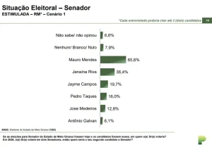 Para disputa ao Senado — que em 2026 terá duas cadeiras por estado e o Distrito Federal –, o atual governador Mauro Mendes (União) aparece com 65,6%. Na segunda posição vem a deputada estadual Janaina Riva (MDB), com 36,4%. Jayme Campos tem 19,7%, Pedro Taques (PSB) surge com 16%, José Medeiros (PL), 12,8% e Antonio Galvan (DC), 6,1%. Nenhum, branco ou nulo somam 7,9%, não sabem ou não opinaram, 6,6%.