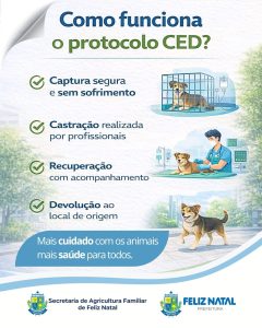 A Prefeitura de Feliz Natal passou a adotar o protocolo CED Captura, Esterilização e Devolução como estratégia para o manejo de cães e gatos em situação de rua. A iniciativa busca controlar a população desses animais de forma ética, segura e com impacto direto na saúde pública do município.
