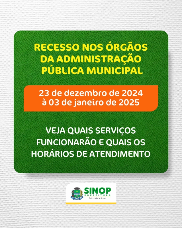 O Decreto que institui recesso no órgãos que compõem a estrutura administrativa da Prefeitura de Sinop, determina, ainda, que no período estabelecido (23/12/24 à 03/01/25), sejam prestados os serviços públicos considerados imprescindíveis, como os trabalhos desenvolvidos pela Guarda Civil Municipal e Cemitério Municipal.