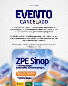 A Prefeitura de Sinop reforça que a nova data do evento será divulgada em breve, mantendo o objetivo de debater com o setor produtivo o potencial da implantação de uma Zona de Processamento de Exportação no município, considerada uma ferramenta estratégica para atração de indústrias, geração de empregos e ampliação das exportações.