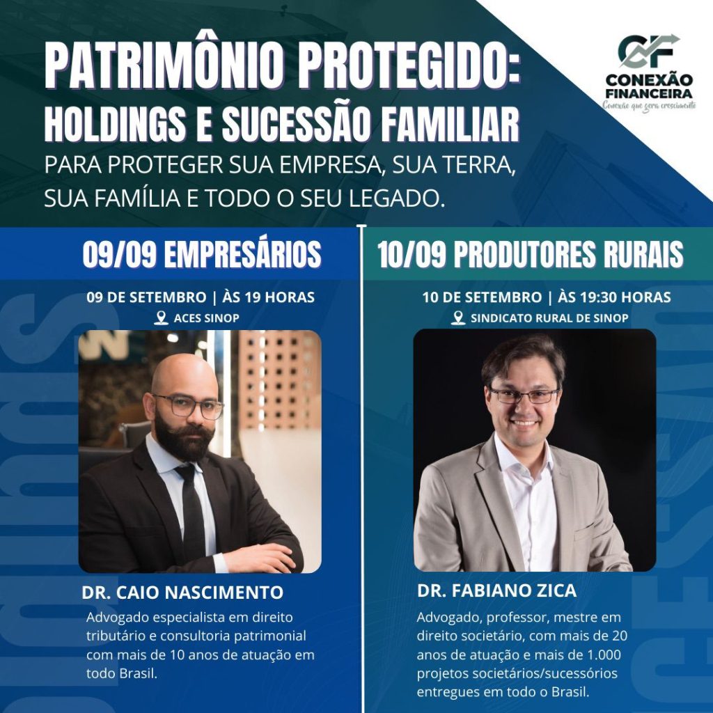 Em Sinop, nos dias 09 e 10 de setembro, empresários e produtores rurais terão a oportunidade de acompanhar os especialistas de renome nacional, Dr. Caio Nascimento, advogado especialista em direito tributário e consultoria patrimonial e Dr. Fabiano Zica, advogado e mestre em direito societário. Os dois encontros são voltados para quem busca organizar holdings, reduzir custos tributários e garantir a continuidade dos negócios entre gerações.