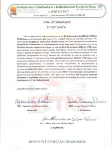 A eleição para a nova Diretoria e o Conselho Fiscal do Sindicato dos Trabalhadores e Trabalhadoras Rurais de Sinop (MT) será realizada no dia 27 de dezembro de 2025, das 7h às 17h, conforme edital divulgado pela entidade. O processo eleitoral acontecerá na Avenida dos Ingás, nº 4711, no bairro Jardim Violetas, e será aberto exclusivamente aos associados que estiverem em dia com suas contribuições, garantindo o direito de votar e ser votado conforme as normas do Estatuto Social. A votação definirá a gestão que conduzirá o sindicato nos próximos anos, em um período marcado por demandas importantes para a categoria rural.