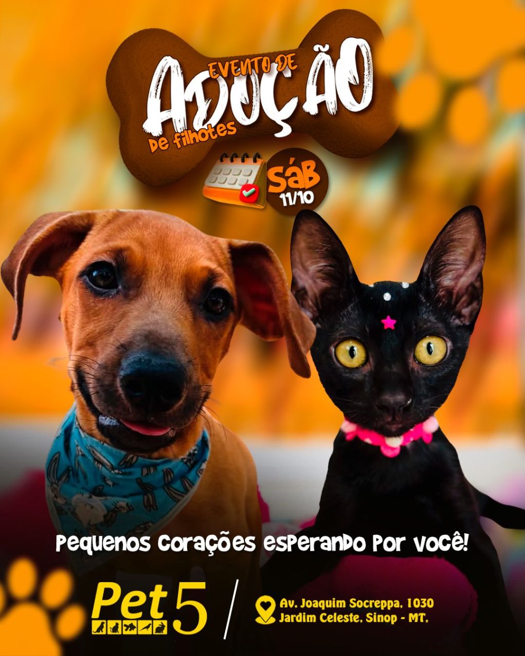 A Associação Protetora dos Animais de Sinop (APAMS) realiza neste sábado, dia 11 de outubro, mais uma edição do seu tradicional Evento de Adoção de Filhotes, em parceria com a Pet 5, localizada na Av. Joaquim Socreppa, nº 1030, no Jardim Celeste.