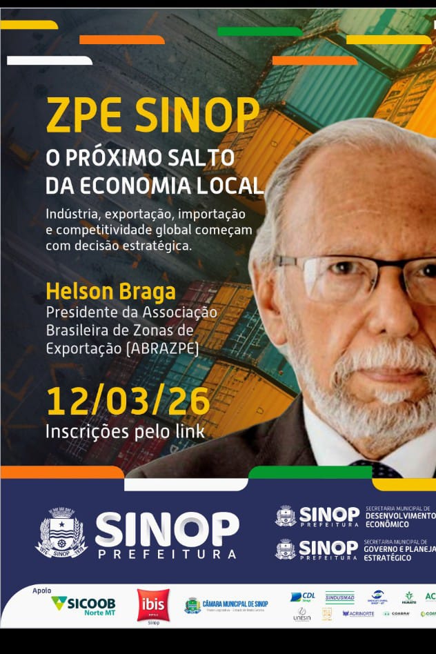 O palestrante confirmado é Helson Braga, presidente da Associação Brasileira de Zonas de Exportação (ABRAZPE), que abordará o tema “Potencial e impactos da ZPE na economia de Sinop”. As inscrições já estão abertas por meio de formulário online divulgado pela organização, e o local será informado aos participantes com 15 dias de antecedência.