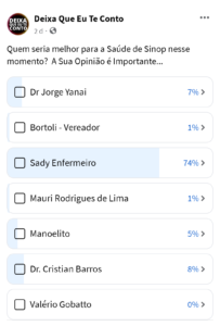 A enquete teve duração de 48 horas e foi realizada na página do Facebook do site e mostra que 74% dos participantes sugere o enfermeiro Sadi no comando da Saúde municipal, com 348 votos e sem segundo o Médico ex – secretário municipal de saúde DR Kristian Barros com 8% das sugestões com 41 votos.