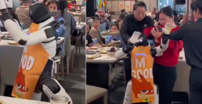 Atendente mecânico de aparência humanóide mostrava alguns passos de dança quando atingiu pratos de comida, provocando uma...