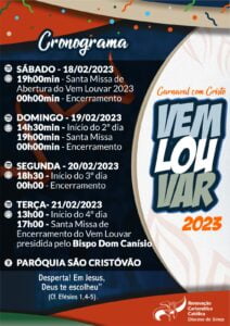 Para os munícipes que desejam ter um Carnaval cheio de animação, alegria, amigos e estar cada vez mais conectado com Deus, o vem Louvar acontecerá nos dias 18, 19, 20 e 21 de fevereiro na paróquia São Cristóvão.