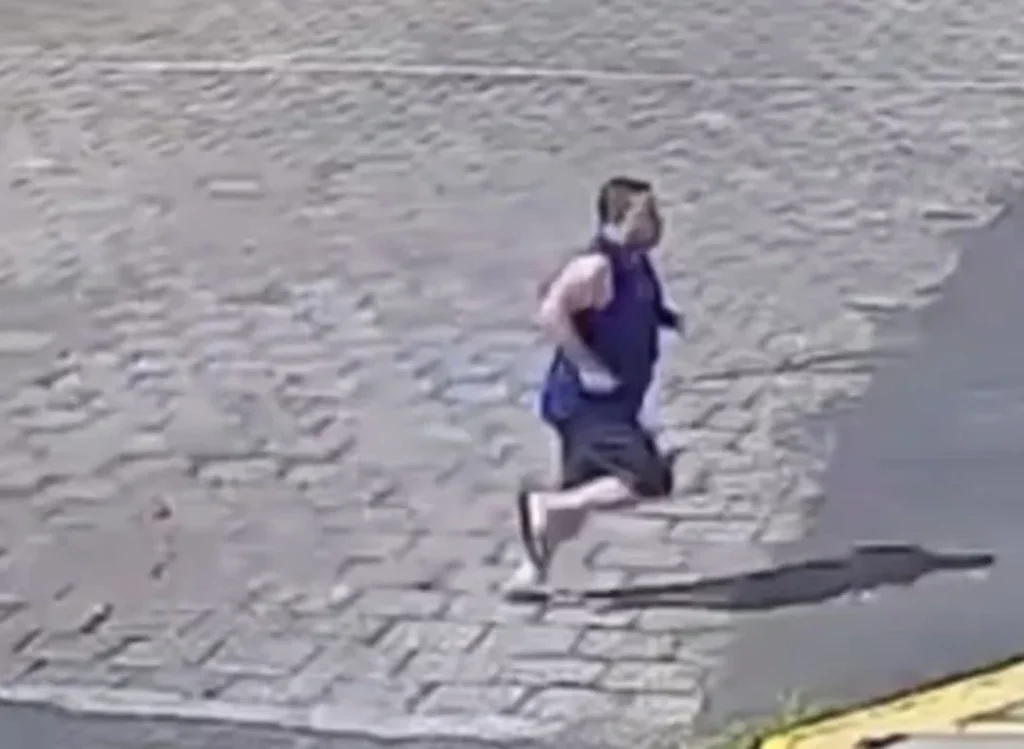 Depois Rodrigo aparece correndo em direção ao carro e ainda com a arma do crime na mão direita.